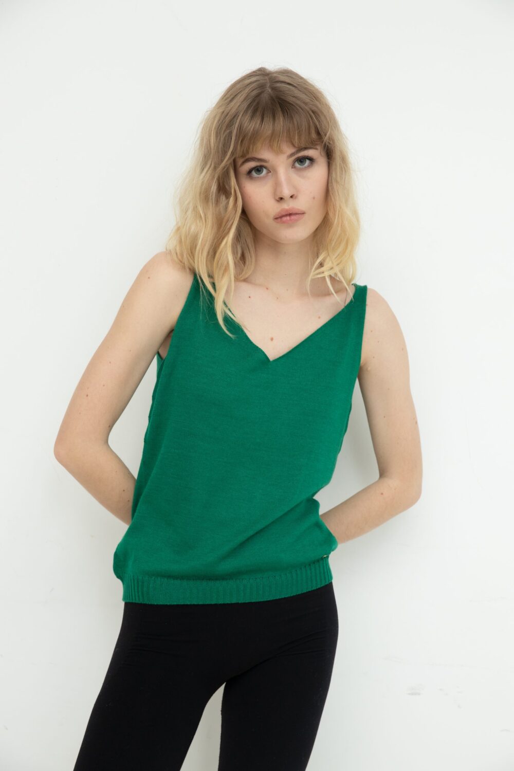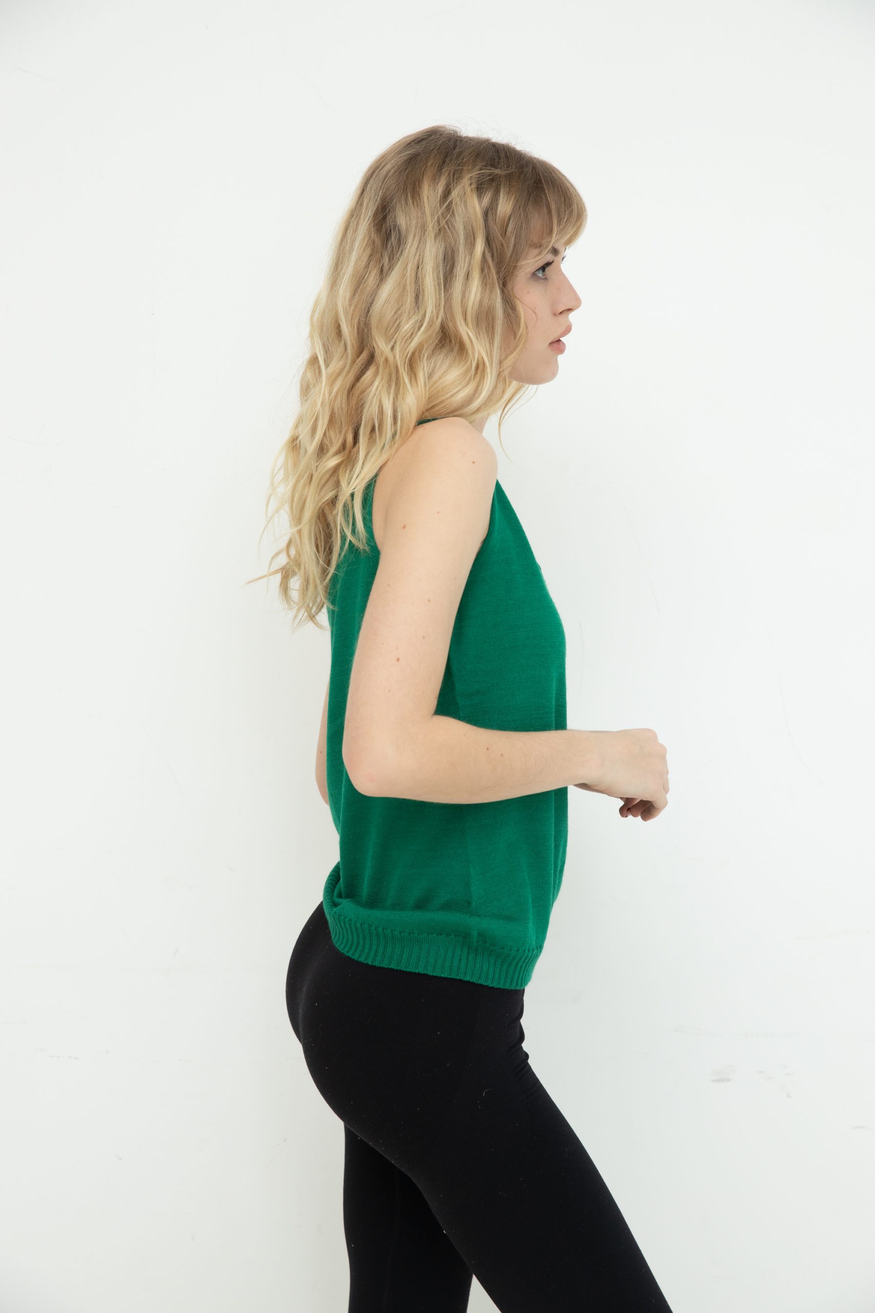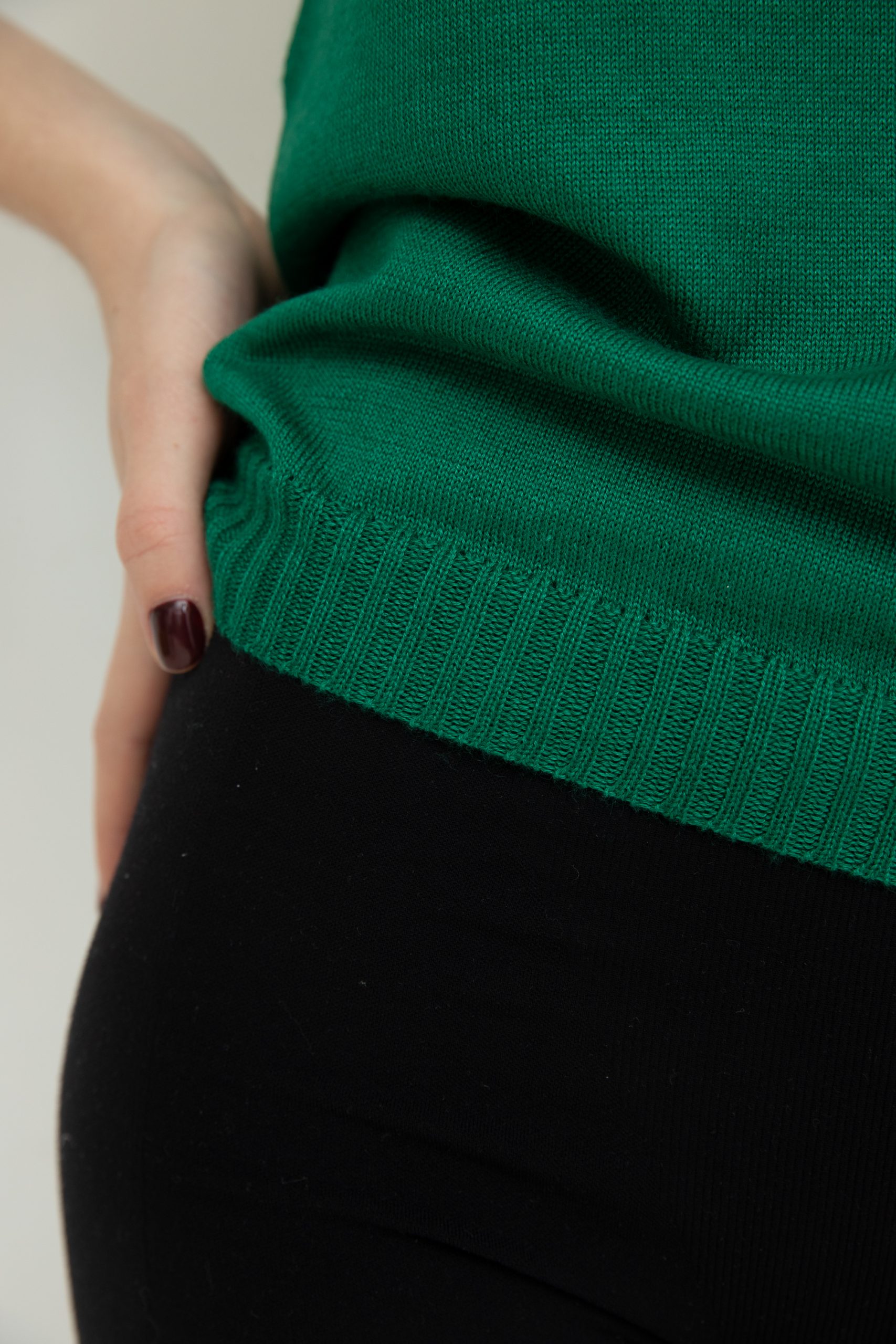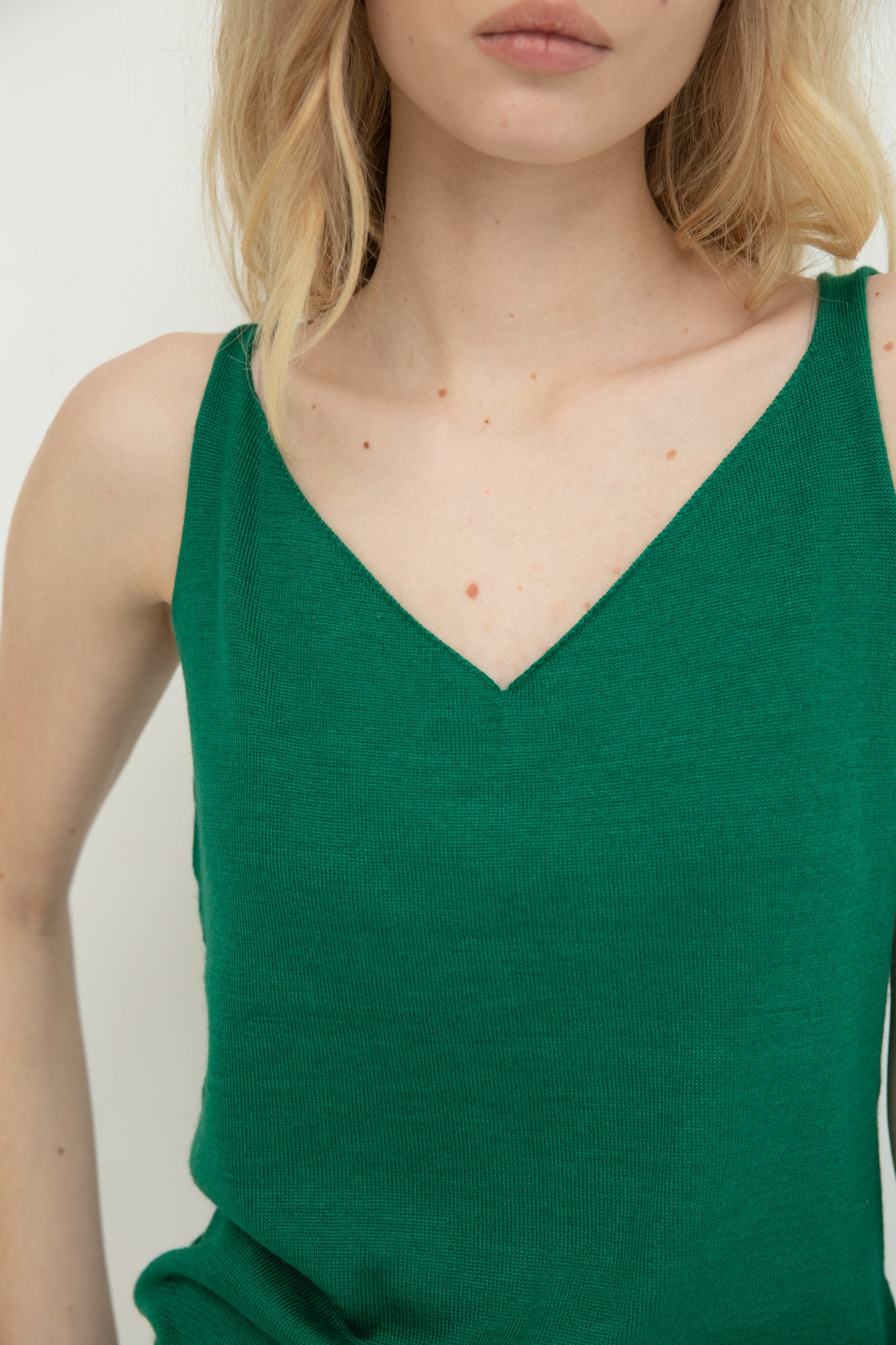 Маєчка у зеленому кольорі – неймовірно тонка, зі складом 70% кашеміру і 30% шовку Loro Piana, ніжна та м’яка.