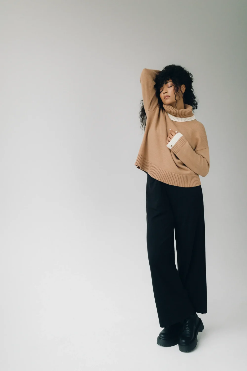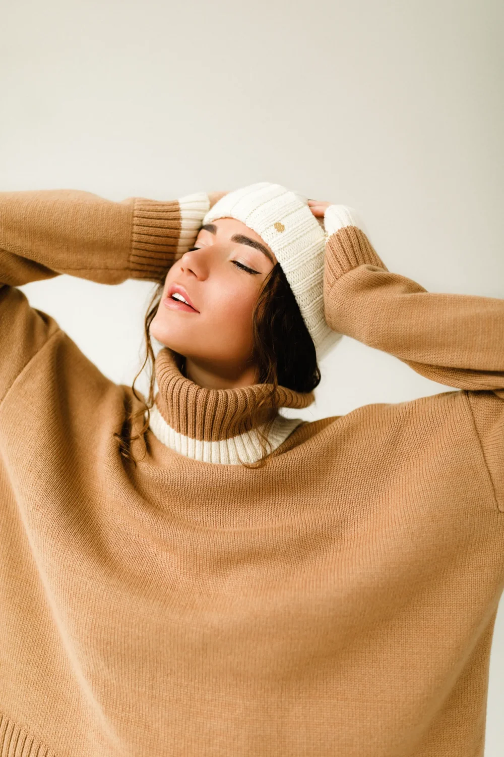 Светр оверсайз з 100% дитячого кашеміру Loro Piana в молочну смужку з верблюжої шерсті. Один розмір. Довгий рукав, дуже зручний, можна носити з джинсами, класичними брюками та спідницями – чудово поєднується з різними стилями.