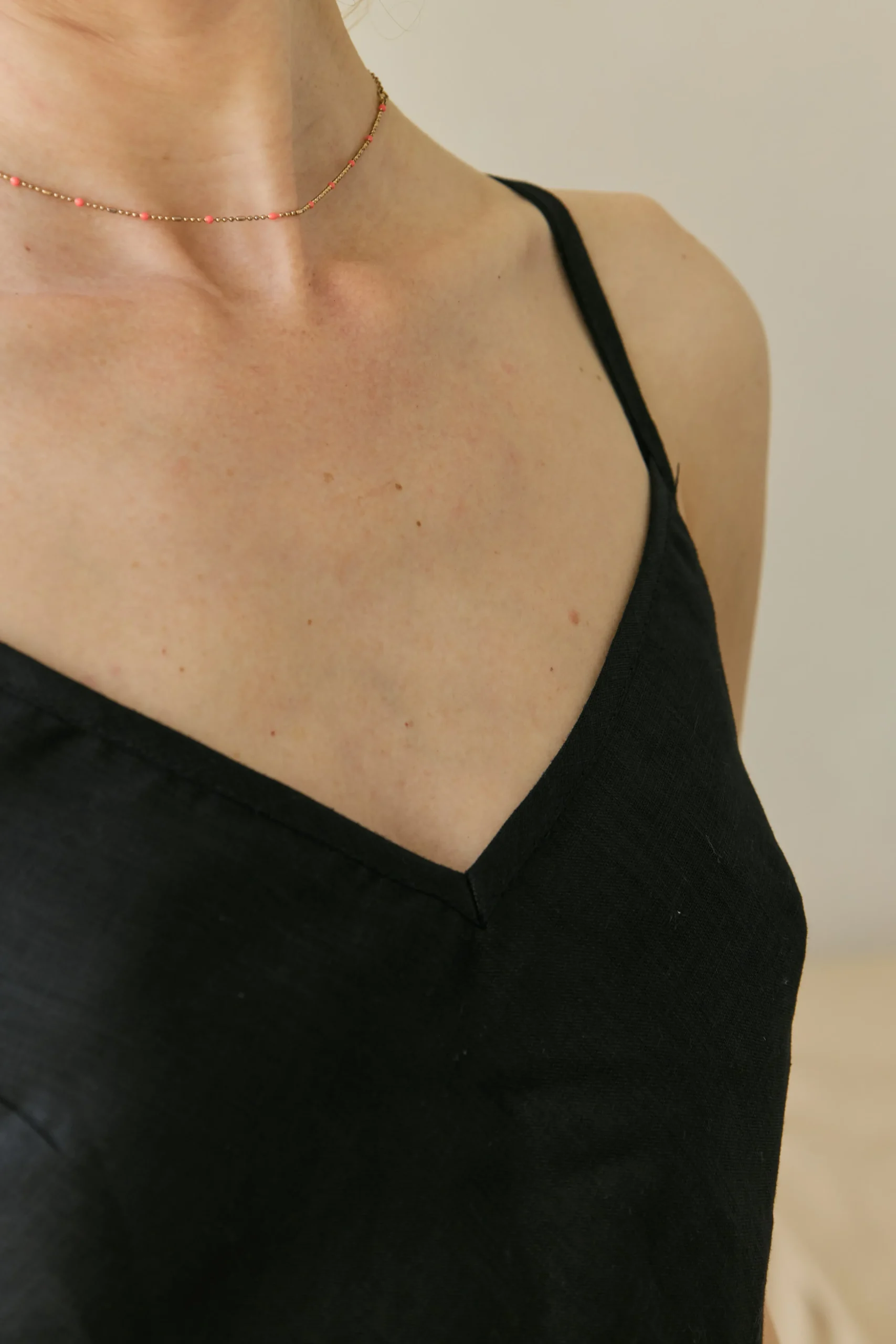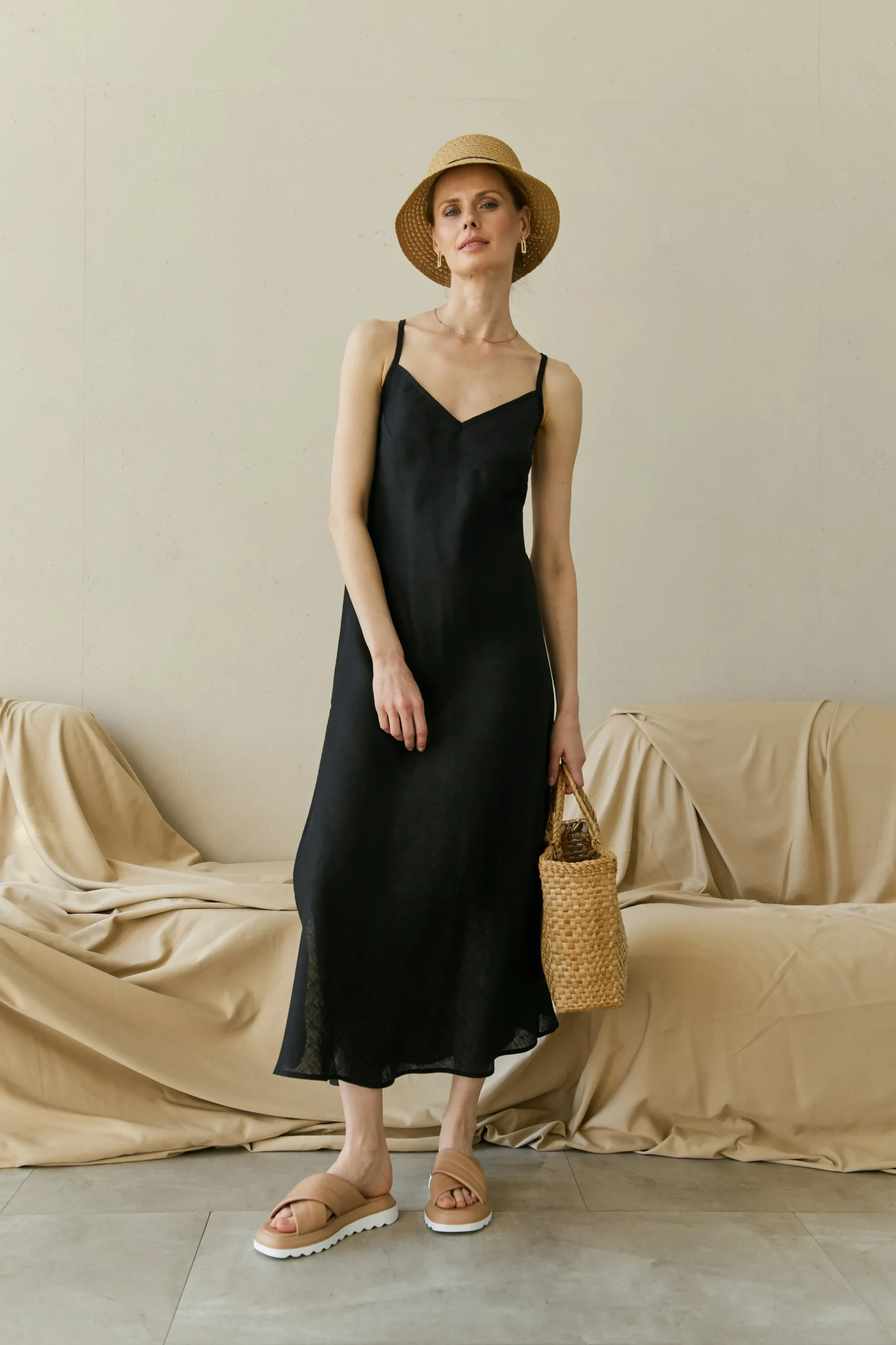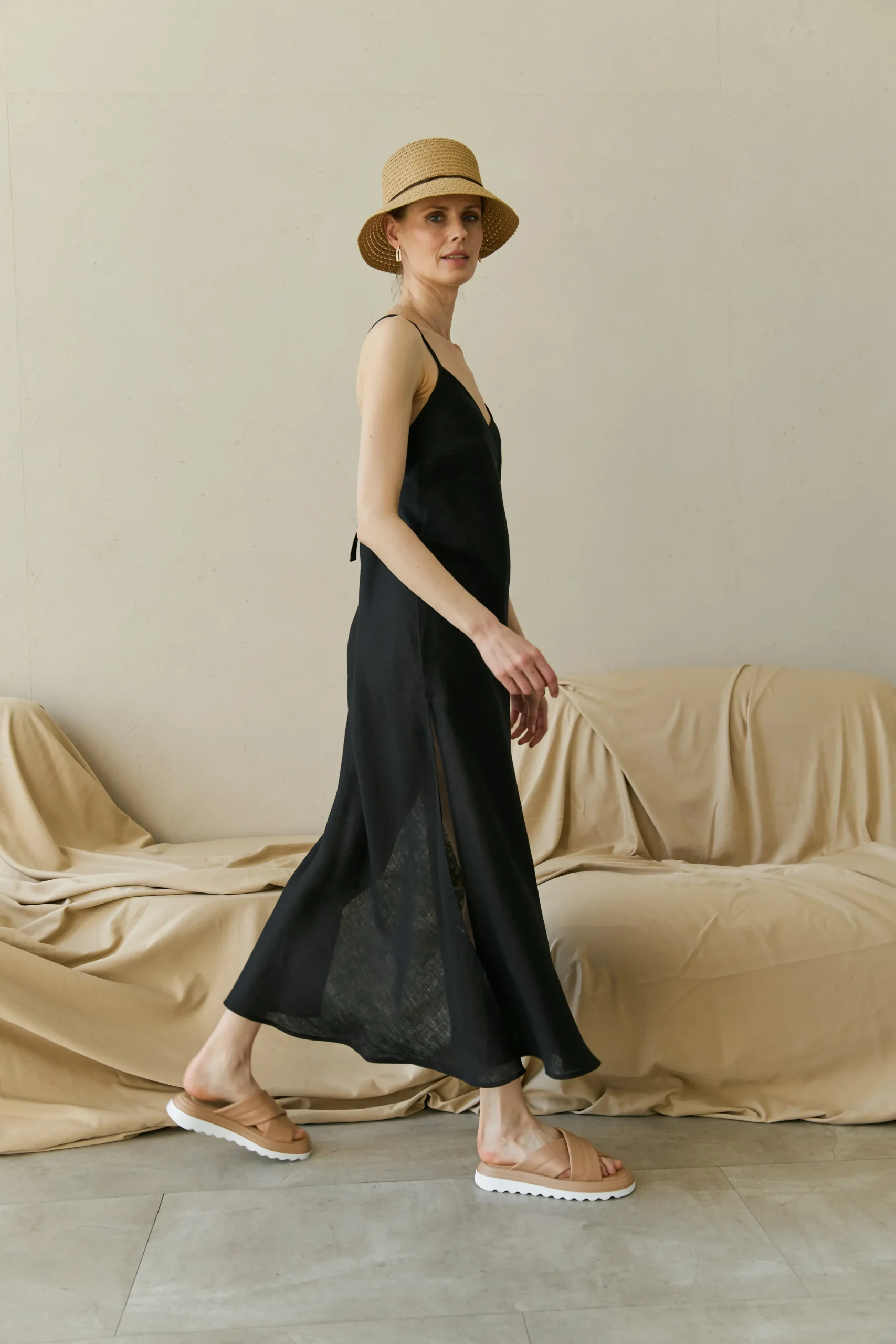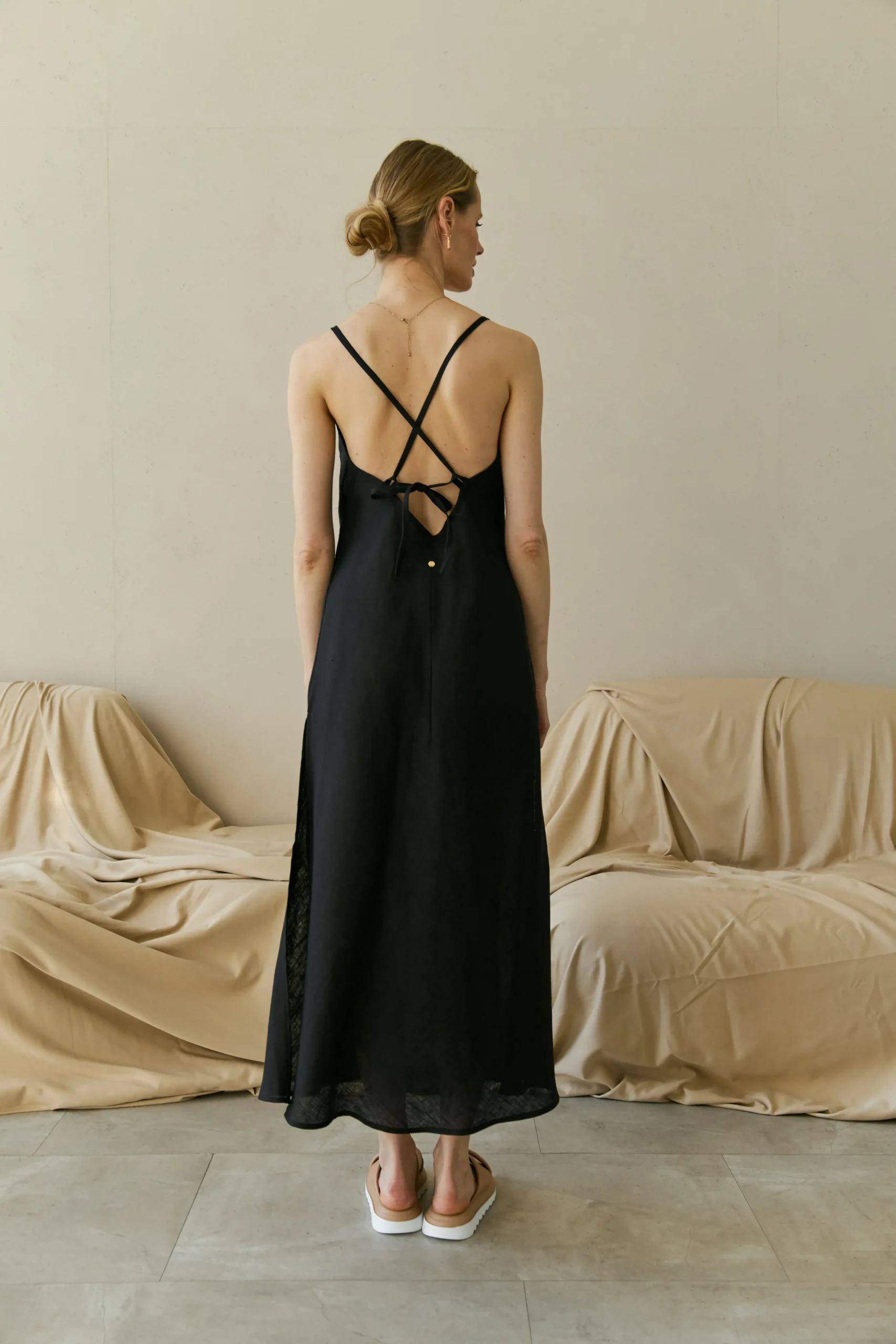 Льняный сарафан на тонких бретелях с разрезами. Бретели регулируются по высоте, можно завязывать прямо или крест-накрест.